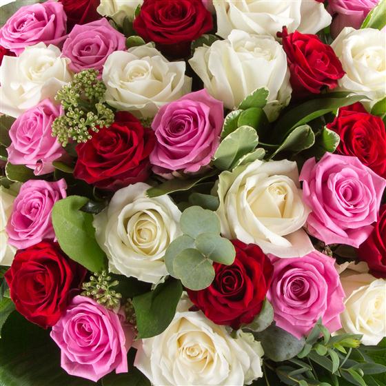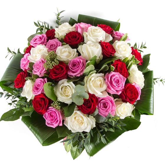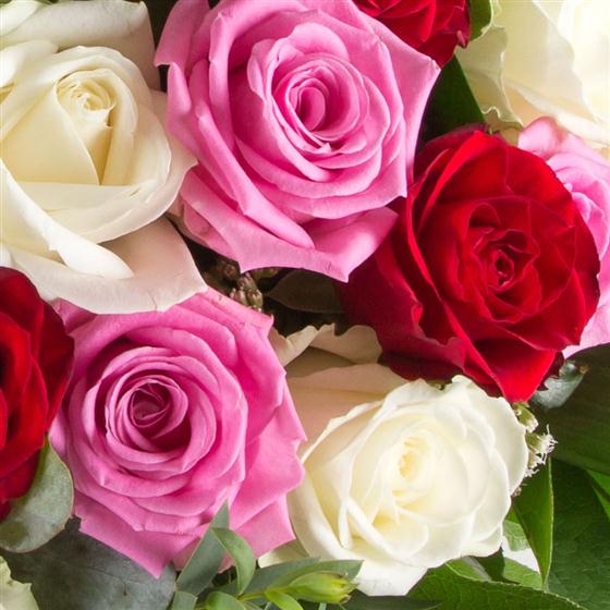A show stopping hand-tied bouquet of 24 closely bound roses in pink, red and white. Vase included, image displayed is of the deluxe 36 roses. please call the shop before ordering and allow 1 days notice.