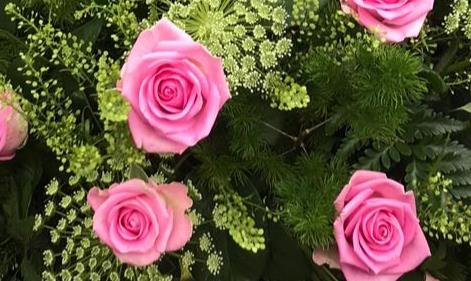 A beautiful tribute of pink aqua roses with ammi and thelaspi.