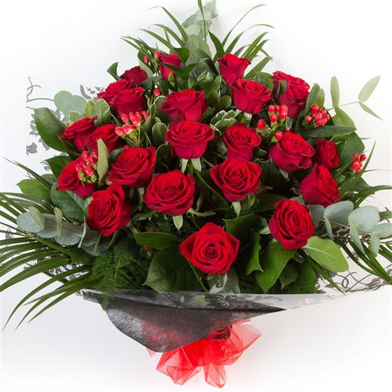 A show stopping bouquet of 24 long stemmed roses, hand-tied and presented in co-ordinating gift wrap. Available in four different colour options, red, pink, white or yellow. PLEASE ALLOW 1 DAYS NOTICE FOR ANY COLOUR OF ROSES PLEASE.